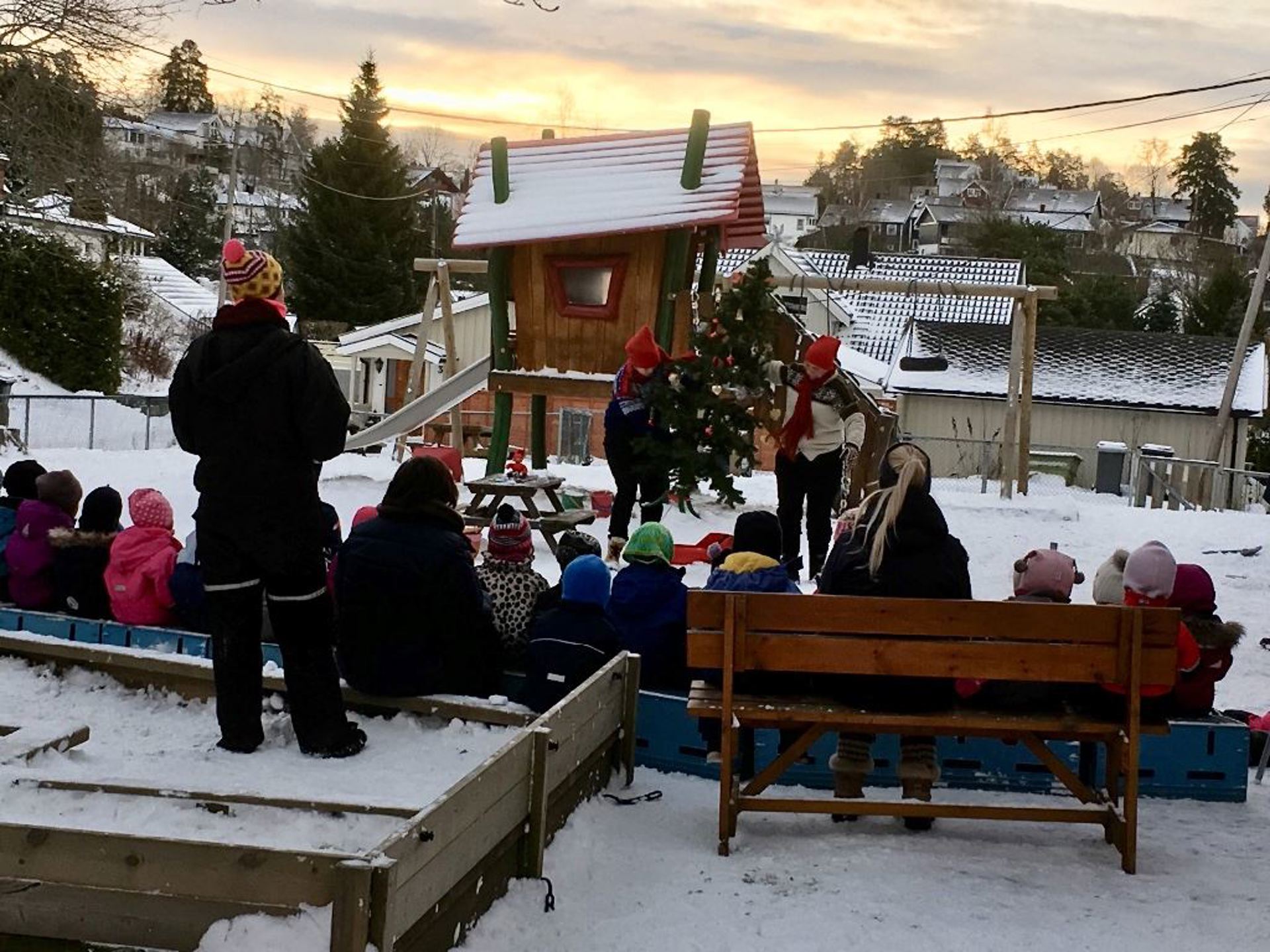 I dag er det klart for julebord! Vi startet opp med fellessamling ute, der nissene bidro til julestemning. Vi gikk også rundt juletreet. Etterpå ble barna fordelt på tre avdelinger, og ble servert kalkun og halalkylling med saus, poteter og grønnsaker! Namnam. Vi er heldige som har egen kokk i barnehagen vår!